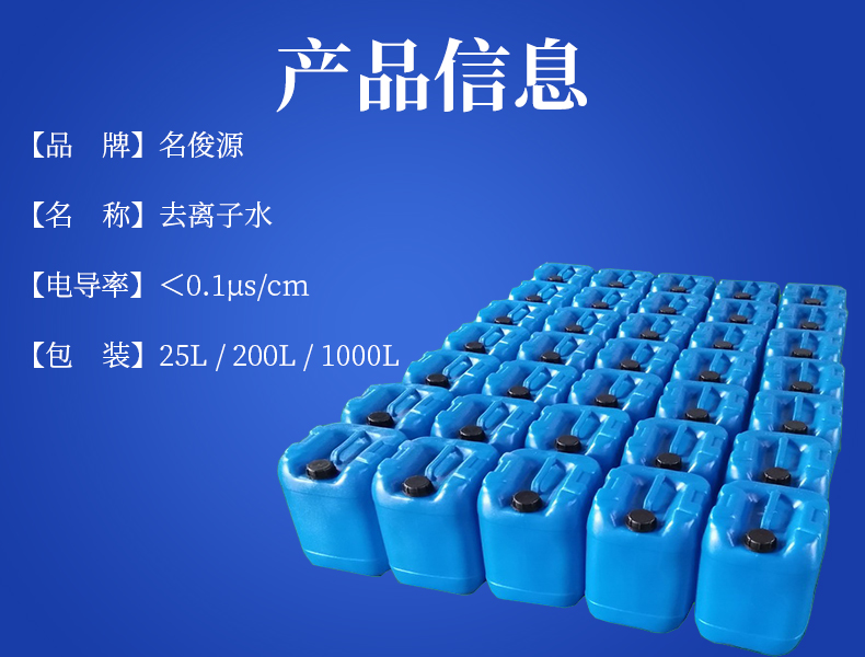 我公司去離子水產(chǎn)品電導(dǎo)率范圍:0.1us/cm~0.055us/cm、電阻率范圍:15 MΩ.cm~18.2 MΩ.cm,采用PE桶包裝。
